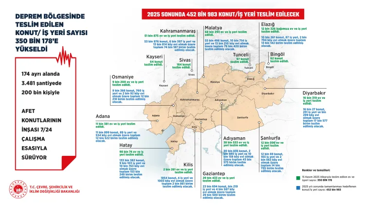 Çevre, Şehircilik ve İklim Değişikliği Bakanı Murat Kurum, deprem bölgesindeki yeniden inşa çalışmalarında 350 bin bağımsız bölümün tamamlandığını açıkladı. İşte il il bölgedeki son durum..