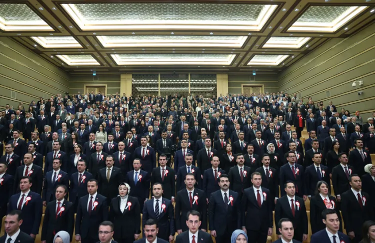 Cumhurbaşkanı Recep Tayyip Erdoğan, Cumhurbaşkanlığı Külliyesi'nde düzenlenen 110. Dönem Kaymakamlar Kurası Töreni'nde 16'sı kadın toplam 110 kaymakam adayına seslendi. Erdoğan, "Kibirden uzak durun, halkın duasını alın" dedi.