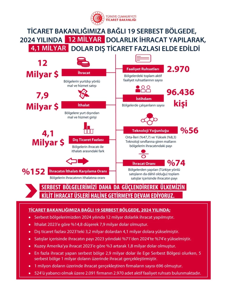 Ticaret Bakanlığı'na bağlı 19 Serbest Bölgede, 2024 yılında 12 Milyar Dolar ihracat yapılarak 4,1 milyar dolar dış ticaret fazlası elde edildi.