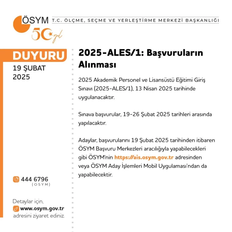 ANKARA (İGFA) - ÖSYM, 2025 Akademik Personel ve Lisansüstü Eğitimi Giriş Sınavı (2025-ALES/1) başvurularını almaya başladığını duyurdu.