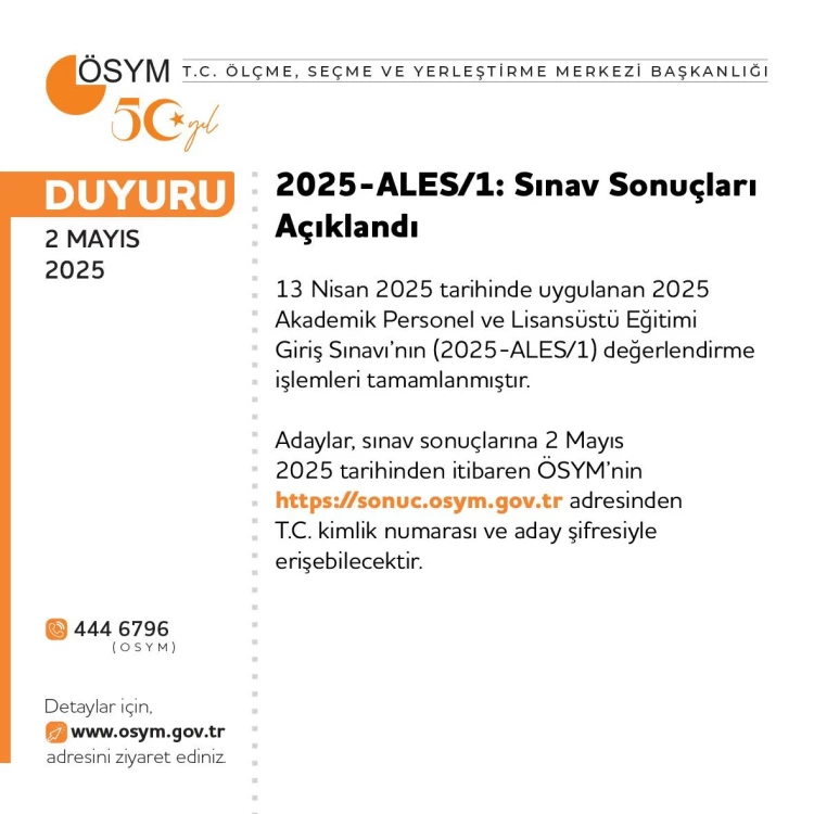 ÖSYM, 2025 Akademik Personel ve Lisansüstü Eğitimi Giriş Sınavı (2025-ALES/1) sonuçlarını açıkladı.