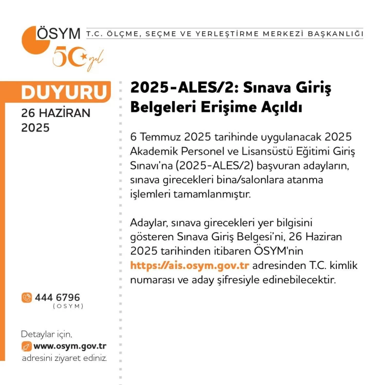 ÖSYM, 6 Temmuz 2025'te yapılacak 2025-ALES/2 sınavına başvuran adayların sınava giriş belgelerinin erişime açıldığını duyurdu; sınav günü saat 10.00'dan sonra bina girişi yapılamayacak.