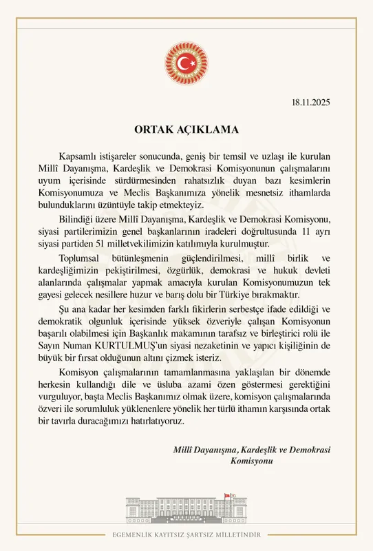 TBMM Başkanlığı, Milli Dayanışma, Kardeşlik ve Demokrasi Komisyonu'nun 17. toplantısına ilişkin detayları paylaşarak komisyonun çalışmalarını hedef alan eleştirilerle ilgili sert bir açıklama yaptı. 21 Kasım'da yeniden toplanacak komisyonun gündeminde İmralı Yüksek Güvenlikli Ceza İnfaz Kurumuna gidilmesi konusu görüşülecek.