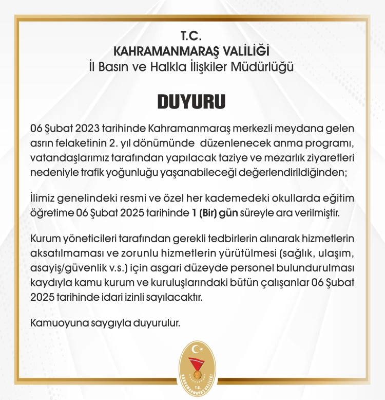 6 Şubat'ta düzenlenecek anma programı ve depremde yakınlarını kaybetmiş vatandaşlar tarafından yapılacak mezarlık ziyaretleri dolayısıyla, Adıyaman'dan sonra Malatya ve Kahramanmaraş'ta da kamu kurum ve kuruluşlarda çalışan personelin kamu hizmetlerini aksatmayacak, tüm tedbirler alınacak şekilde, 1(Bir) gün idari izinli sayılacağı bildirildi.