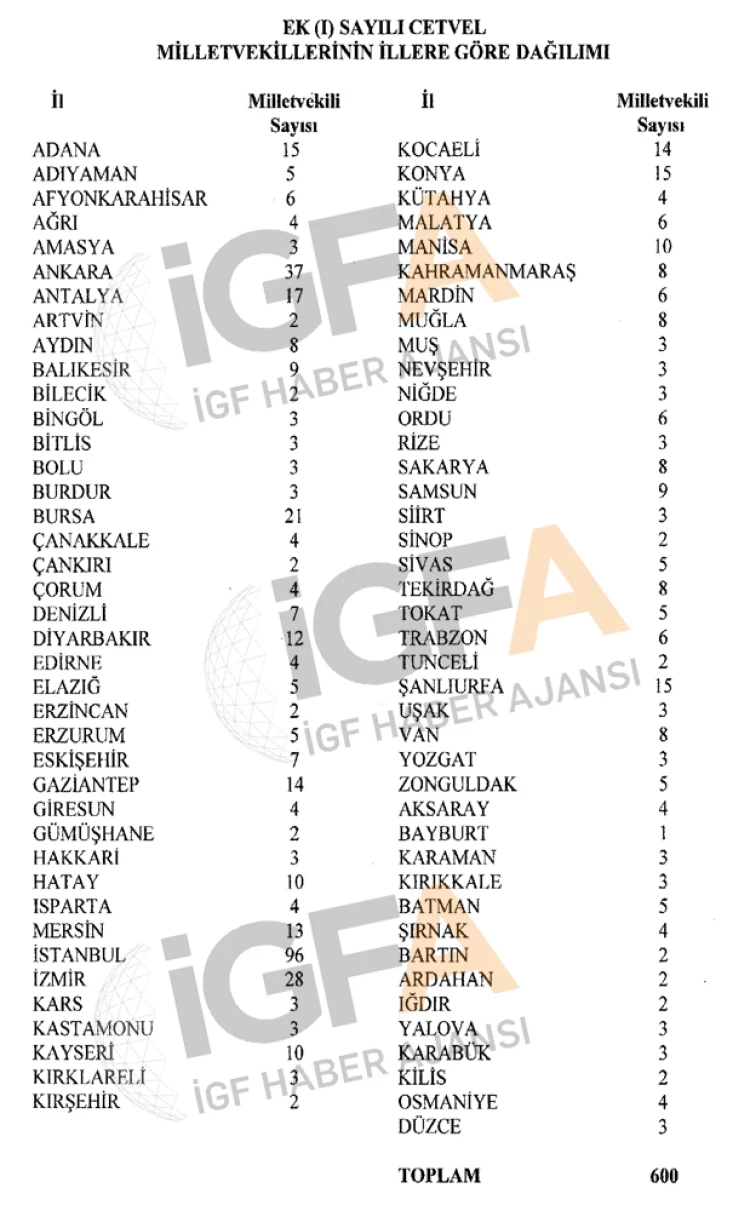 Bu kapsamda 600 milletvekilinin il ve seçim bölgelerine göre dağılımları yer aldı.