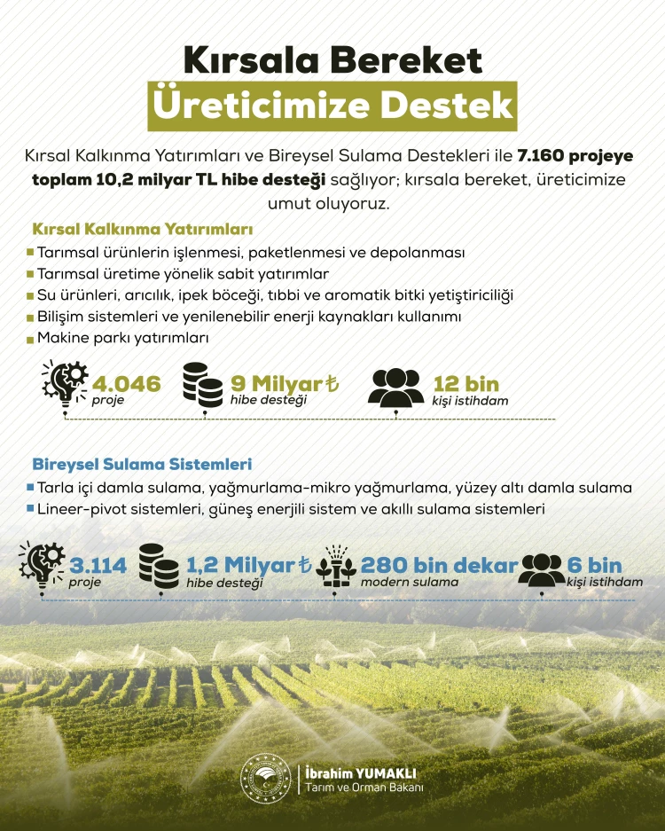 "Kırsala bereket, üreticimize destek" diyerek kırsal kalkınma yatırımları 4 bin 46 projeye 9 milyar liralık hibe desteği ile 12 bin kişi istihdamın sağlanacağını duyuran Bakan Yumaklı, bireysel sulama sistemlerinde 3 bin 114 projeye 1,2 milyar lira hibe desteği ile 6 bin kişinin istihdam sağlayacağı ve 280 bin dekarlık alanın modern şekilde sulanacağını belirtti.