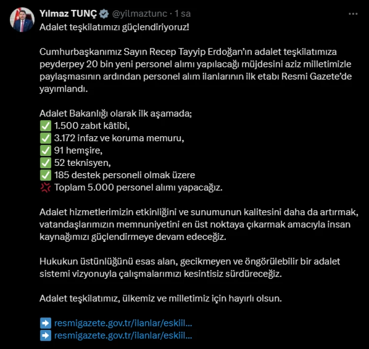 Adalet Bakanı Yılmaz Tunç, Cumhurbaşkanı Recep Tayyip Erdoğan'ın adalet teşkilatına 20 bin yeni personel alımı müjdesinin ardından, ilk etapta 5 bin personelin alınacağını duyurdu. Bin 500 zabıt kâtibi, 3 bin 172 infaz ve koruma memuru, 91 hemşire, 52 teknisyen ve 185 destek personeli alımı için ilanlar Resmi Gazete'de yayımlandı.