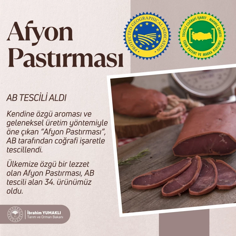 Tarım ve Orman Bakanı İbrahim Yumaklı ile Sanayi ve Teknoloji Bakanı Mehmet Fatih Kacır, Afyon Pastırması'nın Avrupa Birliği'nde coğrafi işaret tescili almasını sosyal medya hesaplarından duyurdu. Türkiye'nin AB'de tescilli 34. ürünü olan Afyon Pastırması, Avrupa sofralarında yerini alacak.