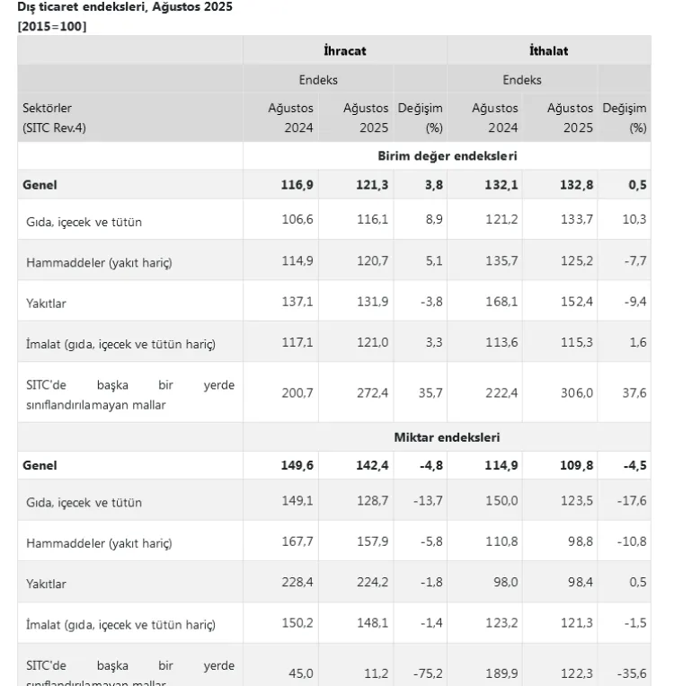 ANKARA (İGFA) - TÜİK verilerine göre, Ağustos 2025'te ihracat birim değer endeksi yüzde 3,8 artış gösterdi.