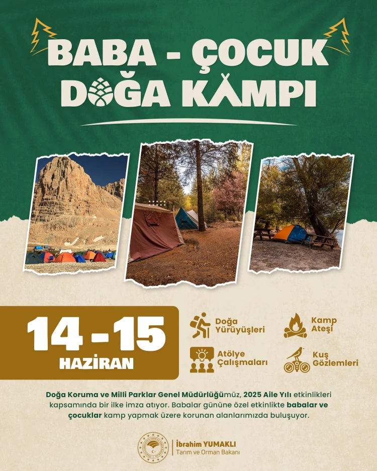 Tarım ve Orman Bakanlığı, 2025 Aile Yılı kapsamında 14-15 Haziran'da 19 şehirde düzenlenecek Baba-Çocuk Doğa Kampı'yla babalar ve çocuklarını doğayla buluşturuyor.