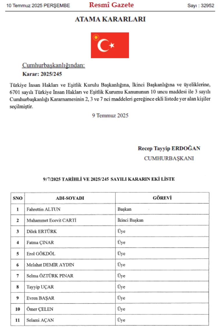 Ayrıca Resmi Gazete'de yayımlanan kararlara göre Prof. Dr. Fahrettin Altun başkanlığındaki TİHEK'in kurulunun teşkilatlanması şöyle oluştu. Muhammet Ecevit Carti TİHEK'in ikinci başkanı olurken; Dilek Ertürk, Fatma Çınar, Erol Gökdöl, Melahat Demir Aydın, Selma Öztürk Pınar, Tayyip Uçar, Evren Başar, Ömer Çelen ve Selami Açan üye oldu.