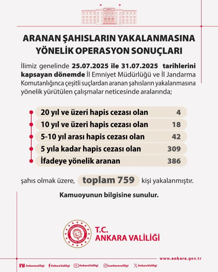 Ankara Valiliği, 25-31 Temmuz 2025 tarihleri arasında İl Emniyet Müdürlüğü ve İl Jandarma Komutanlığı tarafından gerçekleştirilen operasyonlarda, çeşitli suçlardan aranan 759 kişinin yakalandığını duyurdu. Yakalananlar arasında 20 yıl ve üzeri hapis cezası olan 4, 10 yıl ve üzeri cezası olan 18 kişi bulunuyor.