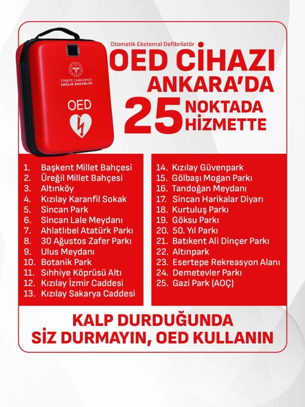 Sağlık Bakanlığı ve ASELSAN iş birliğiyle geliştirilen yerli Otomatik Şok Cihazları (OED), Ankara'da 25 noktaya yerleştirildi. Cihazlar, kalp krizi riskine karşı ambulans gelene kadar yaşam desteği sağlıyor.