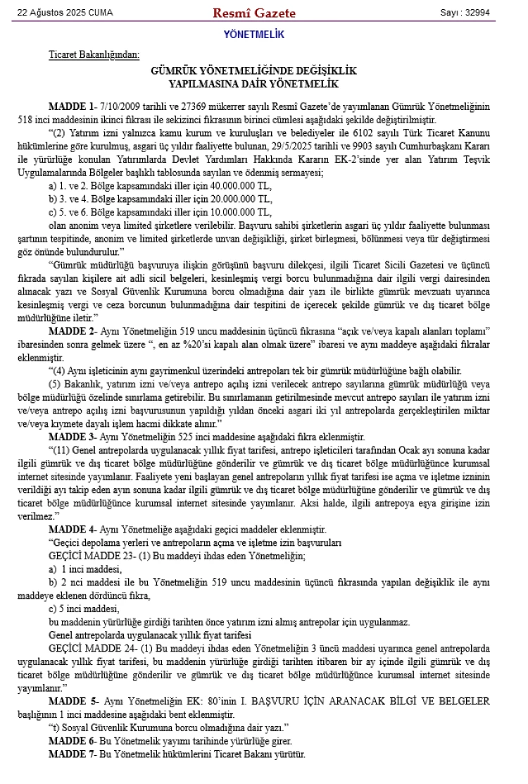 Antrepo alanlarının en az yüzde 20'sinin kapalı alan olacağı ve aynı işleticinin aynı gayrimenkuldeki antrepoları tek bir gümrük müdürlüğüne bağlanabileceğinin altı çizilen yönetmelik değişikliğinde Bakanlık, antrepo sayısına gümrük veya bölge müdürlüğü bazında sınırlama getirebilecek; bu karar, mevcut antrepo sayıları ve son iki yıldaki işlem hacmine göre alınacak.