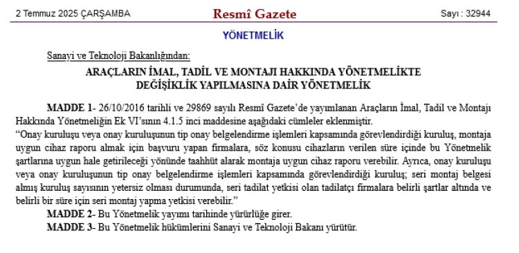 Buna göre yönetmeliğin Ek VI'sının 4.1.5 maddesine eklenen hükümlerle, onay kuruluşları veya tip onay belgelendirme işlemleri için görevlendirilen kuruluşlar, montaja uygun cihaz raporu için başvuran firmalara, cihazların belirlenen süre içinde yönetmelik şartlarına uygun hale getirileceği taahhüdüyle rapor verebilecek. Ayrıca, seri montaj belgesi alan kuruluş sayısının yetersiz olması durumunda, onay kuruluşları, seri tadilat yetkisine sahip firmalara belirli şartlar ve süre sınırı ile seri montaj yetkisi sağlayabilecek.