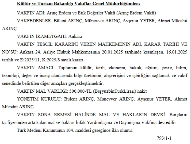 Arınç ailesinden 'Etik Değerler Vakfı'
