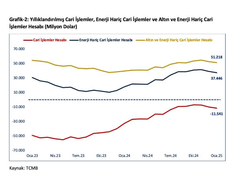 Bakan Bolat, 2024 Yılında Cari İşlemler Açığının 2023 Yılındaki 39,9 Milyar Dolardan 10,0 Milyar Dolara gerilediğin ve Cari İşlemler Açığının GSYH içindeki Payı yüzde 3,5'tan 2,8 Puan Gerileyerek yüzde 0,8 Olarak gerçekleştiğini belirterek, "2024 Yılı Ocak Ayında 2,3 Milyar Dolar Olan Cari İşlemler Açığı 2025 Yılı Ocak Ayında 3,8 Milyar Dolar Olarak Gerçekleşmiştir. 2024 Yılı Ocak Ayında 32,4 Milyar Dolar Olan Yıllıklandırılmış Cari İşlemler Açığı 2025 Yılı Ocak Ayında 11,5 Milyar Dolar Olarak Gerçekleşmiştir. Altın ve Enerji Hariç Cari İşlemler Hesabı 2025 Yılı Ocak Ayında 2,4 Milyar Dolar İle Fazla Vermiştir. Yıllıklandırılmış Bazda Hizmet İhracatı Güçlü Seyrini Devam Ettirerek Ocak Ayında 115,7Milyar Dolara Yükselmiştir" dedi.