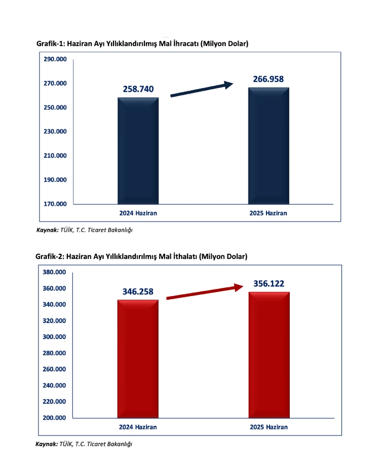 2025'in Ocak-Haziran döneminde ihracat, geçen yıla göre yüzde 4,1 artarak 131,4 milyar dolar oldu. Şubat'taki takvim kaynaklı sınırlı gerileme dışında, yılın ilk 6 ayının 5'inde ihracat yıllık bazda artış gösterdi. Mart'ta 758 milyon dolar (yüzde 3,3), Nisan'da 1,5 milyar dolar (yüzde 7,7), Mayıs'ta 629 milyon dolar (yüzde 2,6) ve Haziran'da 1,5 milyar dolar (yüzde 7,9) artış kaydedildi.İthalat ve Dış Ticaret AçığıHaziran'da ithalat yüzde 15,2 artarak 28,7 milyar dolar, Ocak-Haziran döneminde ise yüzde 7,2 artarak 180,8 milyar dolar oldu. Yıllıklandırılmış ithalat 9,9 milyar dolar artarak 356,1 milyar dolara ulaştı.