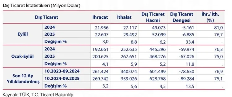 Buna göre 2025 yılı Eylül ayında en fazla ihracat yapılan ülkelerin başını 1,9 milyar dolar ile Almanya çekerken, en fazla ihracat yapılan sektör 3,2 milyar dolar ile motorlu kara taşıtları oldu.
