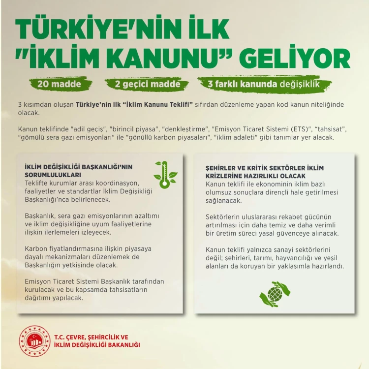 Çevre, Şehircilik ve İklim Değişikliği Bakanı Murat Kurum, TBMM'ye sunulan Türkiye'nin ilk "İklim Kanunu" teklifi ile ilgili sosyal medya hesabından yaptığı paylaşımda, "Türkiye'nin 'İlk İklim Kanunu' iklim değişikliği ile mücadelemize yeni bir soluk getirecek" mesajını verdi. Eylem planları 31 Aralık 2027'ye kadar hazırlanacak.
