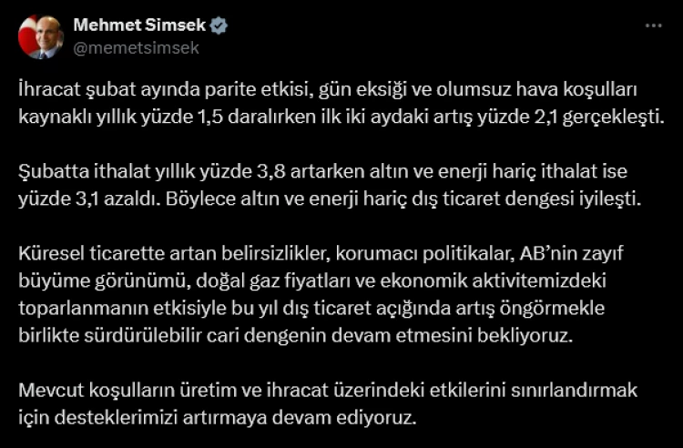 İhracatın Şubat ayında parite etkisinin gün eksiği ve olumsuz hava koşulları kaynaklı yıllık yüzde 1,5 daralırken ilk iki aydaki artış yüzde 2,1 gerçekleştiğini belirten Bakan Şimşek, paylaşımında, Şubat ayında ithalatın yıllık yüzde 3,8 artarken altın ve enerji hariç ithalat ise yüzde 3,1 azaldığını ve böylece altın ve enerji hariç dış ticaret dengesi iyileştiğini kaydetti.