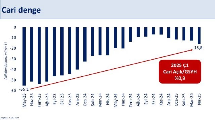 Hazine ve Maliye Bakanı Mehmet Şimşek, Nisan'da cari açığın 39,3 milyar dolar azaldığını, altın ve enerji hariç cari fazlanın 49,5 milyar dolar olduğunu açıkladı. Hizmet ihracatının güçlü performansı cari dengeyi destekliyor.