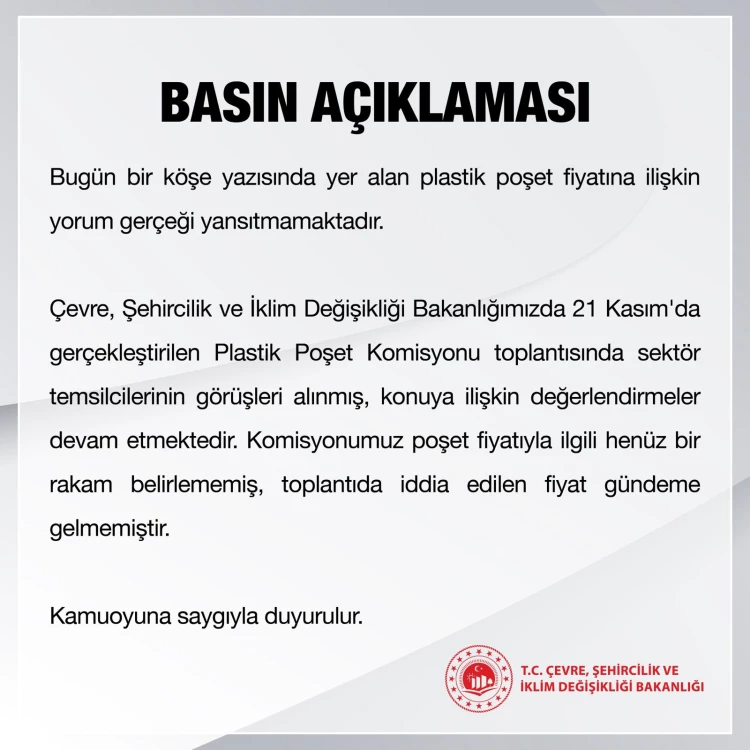 Bakanlığın sosyal medya hesabı üzerinden yapılan bilgilendirmede, "Bugün bir köşe yazısında yer alan plastik poşet fiyatına ilişkin yorum gerçeği yansıtmamaktadır.  Çevre, Şehircilik ve İklim Değişikliği Bakanlığımızda 21 Kasım'da gerçekleştirilen Plastik Poşet Komisyonu toplantısında sektör temsilcilerinin görüşleri alınmış, konuya ilişkin değerlendirmeler devam etmektedir. Komisyonumuz poşet fiyatıyla ilgili henüz bir rakam belirlememiş, toplantıda iddia edilen fiyat gündeme gelmemiştir. Kamuoyuna saygıyla duyurulur" ifadeleri yer aldı.