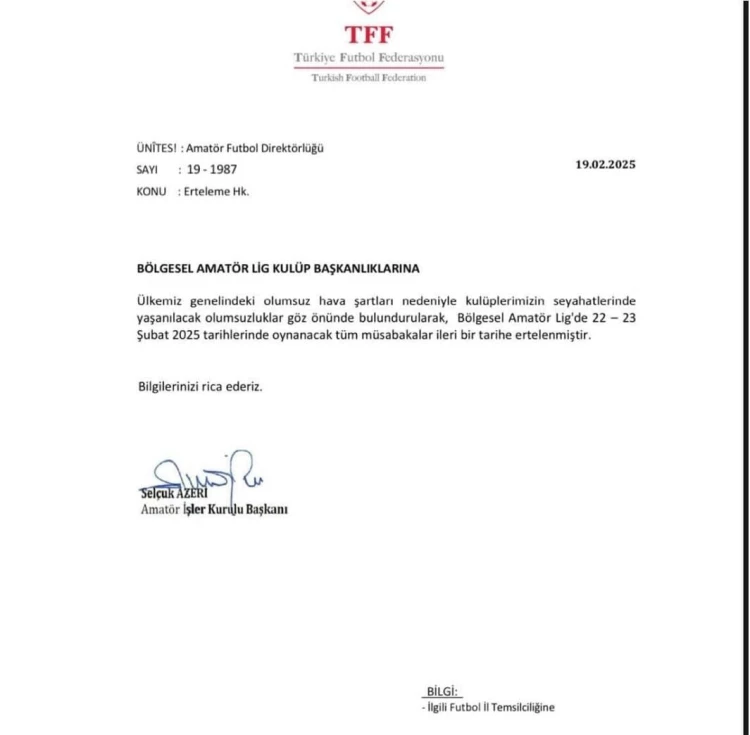 TFF'den, BAL kulüp başkanlıklarına yapılan duyuruda, "Ülkemiz genelindeki olumsuz hava koşulları nedeniyle kulüplerimizin seyahatlerinde yaşanacak olumsuzluklar göz önünde bulundurularak, Bölgesel Amatör Lig'de 22-23 şubat 2025 tarihlerinde oynanacak tüm müsabakalar ileri bir tarihe ertelenmiştir." ifadeleri yer aldı.