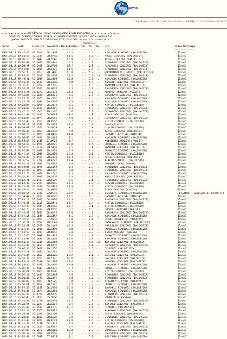 Kandilli Rasathanesi Ve Deprem Araştırma Enstitüsü'nün resmi internet sitesinde yayınlanan son depremlerde, son 3 günde sadece Balıkesir ve Manisa'da meydana gelen depremlerin olması korkutuyor.