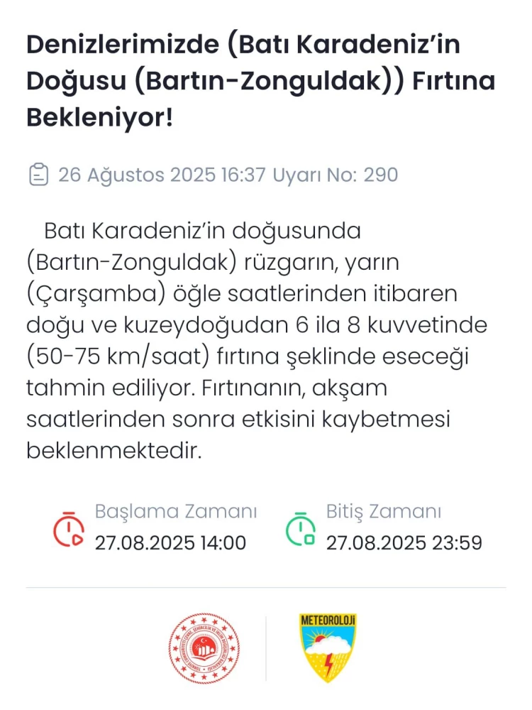Meteoroloji Genel Müdürlüğü, Batı Karadeniz'in doğusunda (Bartın-Zonguldak) fırtına beklendiğini duyurdu. Denizciler ve bölge sakinleri, ulaşım aksamaları ve olası risklere karşı uyarıldı.