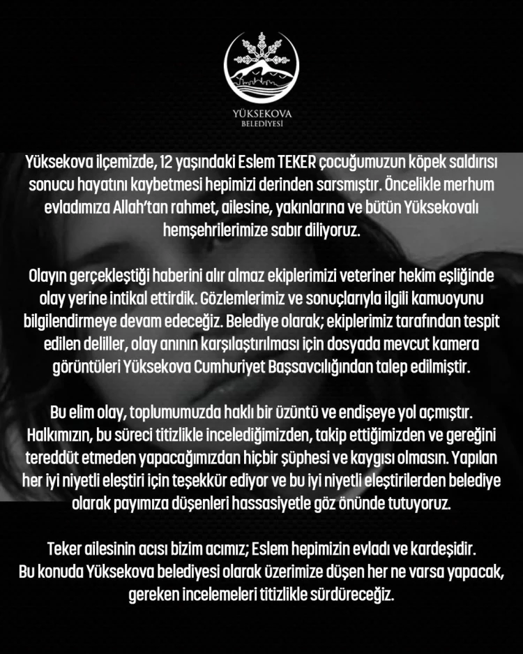 Tarım ve Orman Bakanı İbrahim Yumaklı, Hakkari'nin Yüksekova ilçesinde 12 yaşındaki Eslem Teker'in sahipsiz köpeklerin saldırısı sonucu ölümü üzerine yaptığı açıklamada, başta çocuklar olmak üzere vatandaşların mağduriyetine sebebiyet verenlerin adalet karşısında hesabını vereceklerini söyledi. Olayla ilgili Mülkiye Başmüfettişi görevlendirildi.