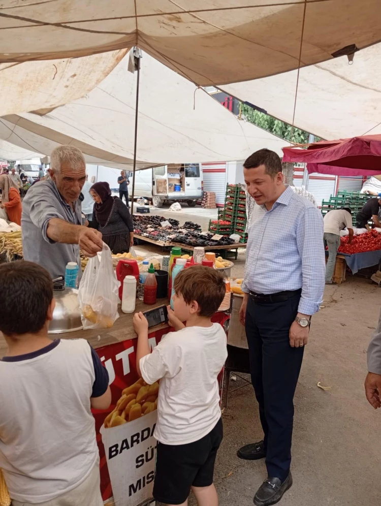Pazarcı esnafıyla birebir görüşen Olgun, alışveriş yaptı, esnafın sofrasına misafir oldu ve samimi bir atmosferde sorunlarını dinledi.