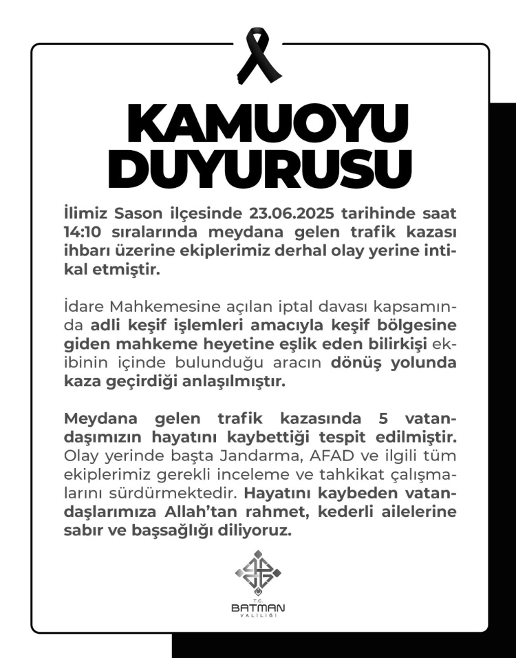 Batman'ın Sason ilçesinde adli keşif çalışmasından dönen bilirkişi ekibini taşıyan araç, trafik kazası geçirdi. Şarampole yuvarlanan araçta bulunan 5 kişi hayatını kaybetti. İçişleri Bakanı Ali Yerlikaya, kazada vefat edenler için taziye mesajı yayımladı.