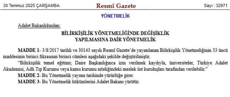 Bugünkü Resmi Gazete'de yayımlanan yeni düzenlemeye göre, bilirkişilik temel eğitiminin verilebileceği kurumların kapsamı genişletildi.