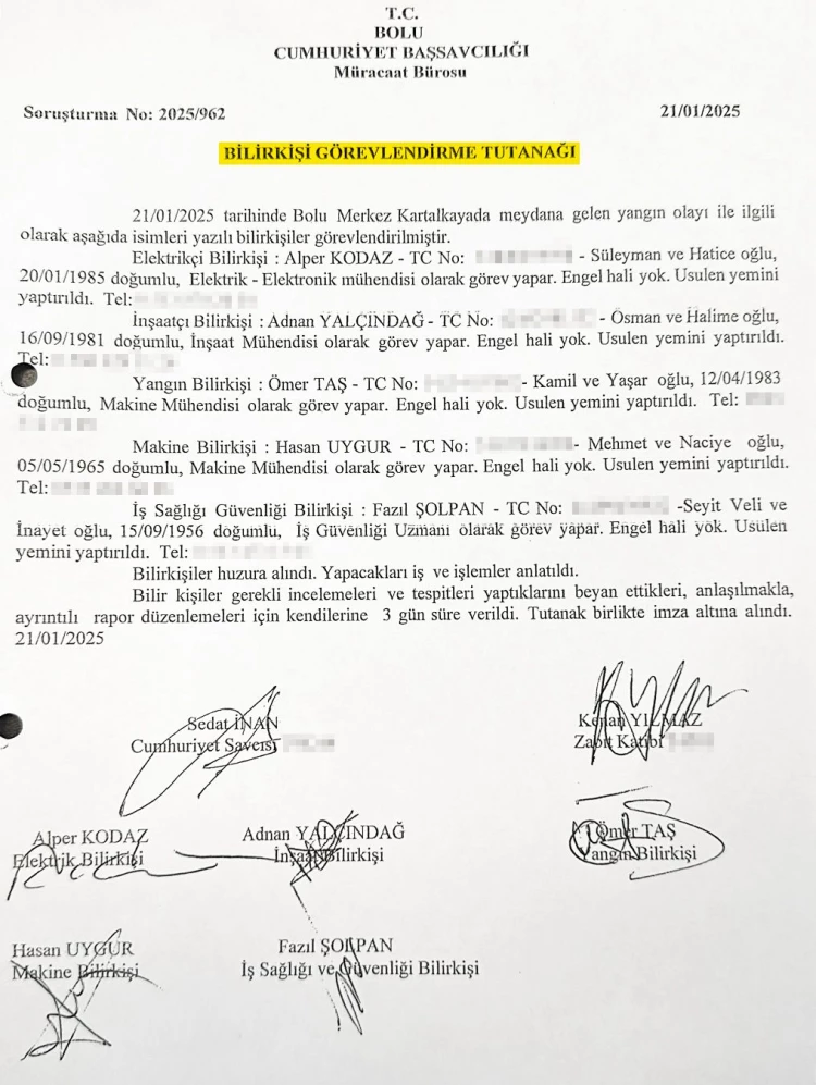 CHP Genel Başkanı Özgür Özel, yangın günü 21 Ocak'ta savcılık talimatı ve resmi yazısı ile oluşturulan Bilirkişi Heyetinin hazırladığı rapor Turizm Bakanlığı'nın sorumluluğuna işaret ettiği için teslim alınmayarak, bizzat Adalet Bakanı tarafından "korsan" ilan edildiğini öne sürerek, "Şimdi o raporu hazırlayan heyetin, Bolu Cumhuriyet Başsavcılığı tarafından görevlendirildiğini gösteren resmi yazıyı kamuoyu ile paylaşıyorum" dedi.