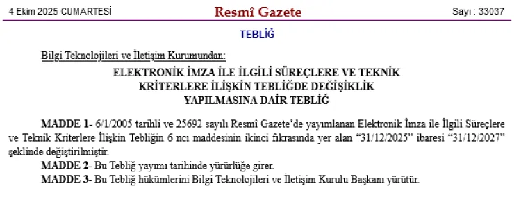 Yapılan değişiklikle, elektronik imza süreçlerine ilişkin teknik kriterlerin geçerlilik süresi iki yıl uzatılarak 31 Aralık 2027'ye çekildi.