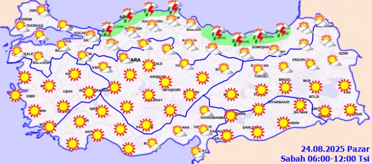 Meteoroloji Genel Müdürlüğü'nün 24 Ağustos tarihli değerlendirmesine göre, Türkiye'nin kuzey kesimleri ile Doğu Akdeniz'de parçalı ve yer yer çok bulutlu hava etkili olacak.