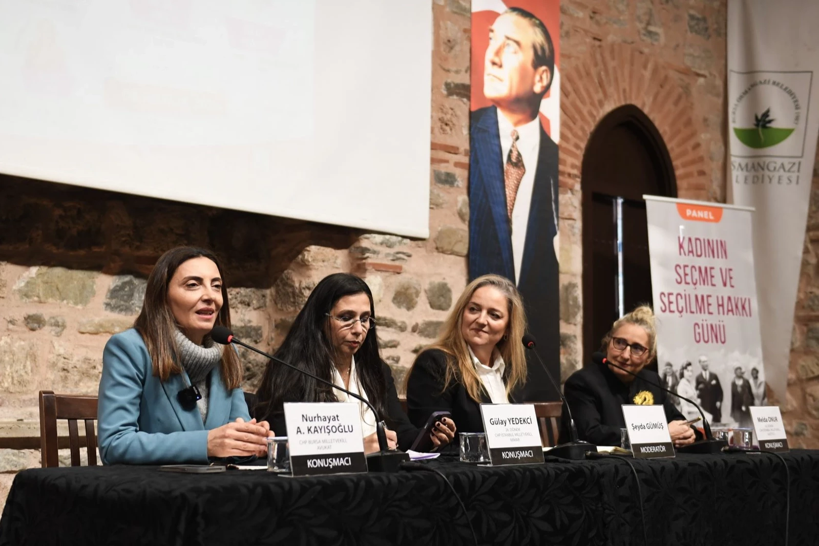 BURSA (İGFA) - Panelde gazeteci Şeyda Gümüş moderatörlüğünde Ördekli Kültür Merkezi'nde düzenlenen "Kadının Seçme ve Seçilme Hakkı" panelinde CHP Bursa Milletvekili NurhayatAltaca Kayışoğlu, CHP 25 ve 26. Dönem İstanbul Milletvekili Gülay Yedekçi ve CHP 24. Dönem İstanbul Milletvekili Melda Okur, konuşmacı olarak katılarak kadının toplumda, yaşamda ve siyasetteki yerine değinerek haklarını konuştu. Kadınlara seçme ve seçilme hakkının verilişinin 90'ıncı yıl dönümünde düzenlenen panele Osmangazi Belediye Başkanı Erkan Aydın, Bursa Büyükşehir Belediye Başkan Vekili Sinan Nergiz, Osmangazi Belediye Başkan Yardımcısı Mutlu Esendemir ve Osmangazili kadınlar katıldı.