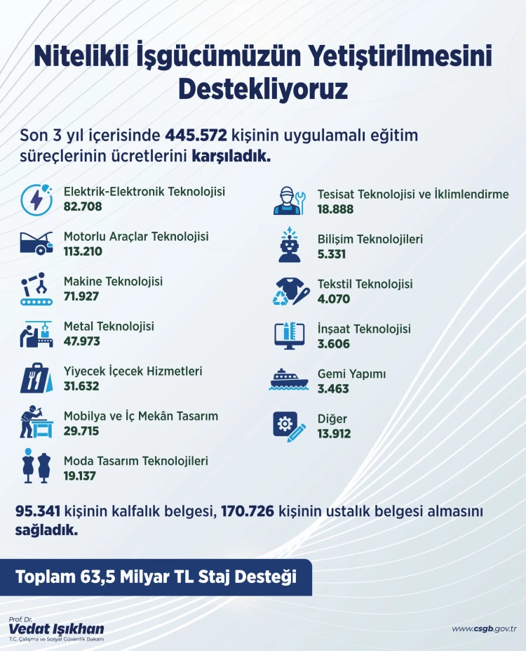 Çalışma ve Sosyal Güvenlik Bakanı Vedat Işıkhan, son 3 yılda 445 bin 572 kişiye 63,5 milyar TL staj desteği sağlandığını, 95 bin 341 kalfalık ve 170 bin 726 ustalık belgesi verildiğini duyurdu. Ulusal İstihdam Stratejisi ile nitelikli iş gücü hedefleniyor.