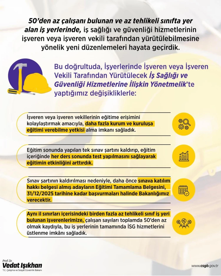 50'den az çalışanı bulunan ve az tehlikeli sınıfta yer alan işyerlerinde, iş sağlığı ve güvenliği hizmetlerinin işveren veya işveren vekili tarafından yürütülebilmesi için alınması gereken eğitimlerin yaygınlaşmasını sağladıklarını belirten Bakan Işıkhan, "Az tehlikeli sınıfta yer alan kamu kurumları ile 10'dan az çalışanı bulunan ve az tehlikeli sınıfta yer alan işyerlerinde, çalışanlara verilecek temel iş sağlığı ve güvenliği eğitimlerine yönelik yeni adımlar atıyoruz" dedi.