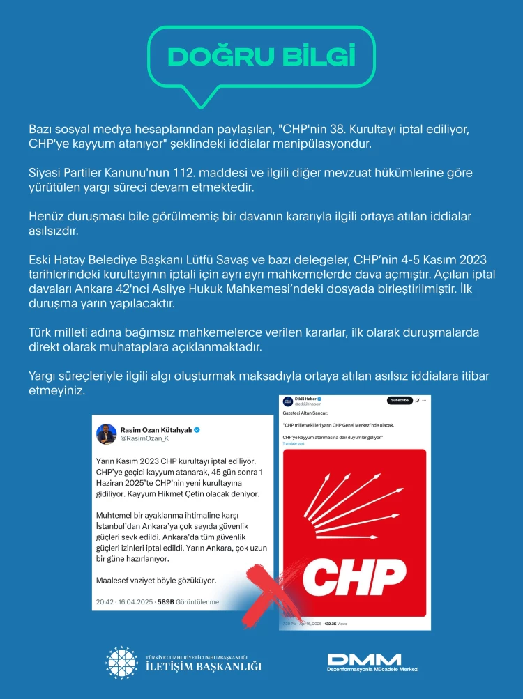 Dezenformasyonla Mücadele Merkezi'nden yapılan açıklamada, "Siyasi Partiler Kanunu'nun 112. maddesi ve ilgili diğer mevzuat hükümlerine göre yürütülen yargı süreci devam etmektedir. Henüz duruşması bile görülmemiş bir davanın kararıyla ilgili ortaya atılan iddialar asılsızdır. Eski Hatay Belediye Başkanı Lütfü Savaş ve bazı delegeler, CHP'nin 4-5 Kasım 2023 tarihlerindeki kurultayının iptali için ayrı ayrı mahkemelerde dava açmıştır. Açılan iptal davaları Ankara 42'nci Asliye Hukuk Mahkemesi'ndeki dosyada birleştirilmiştir. İlk duruşma yarın yapılacaktır. Türk milleti adına bağımsız mahkemelerce verilen kararlar, ilk olarak duruşmalarda direkt olarak muhataplara açıklanmaktadır. Yargı süreçleriyle ilgili algı oluşturmak maksadıyla ortaya atılan asılsız iddialara itibar etmeyiniz" ifadeleri yer aldı.