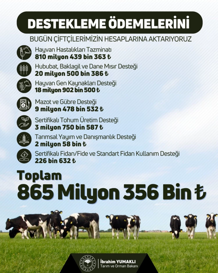Tarım ve Orman Bakanı İbrahim Yumaklı, 865 milyon 356 bin TL'lik tarımsal destekleme ödemesinin bugün çiftçilerin hesaplarına aktarıldığını açıkladı.