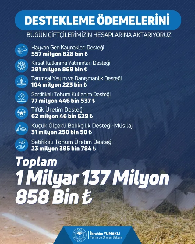 Tarım ve Orman Bakanı İbrahim Yumaklı, toplam 1 milyar 137 milyon 858 bin TL tarımsal destek ödemesinin bugün itibarıyla çiftçilerin hesaplarına aktarılacağını duyurdu.
