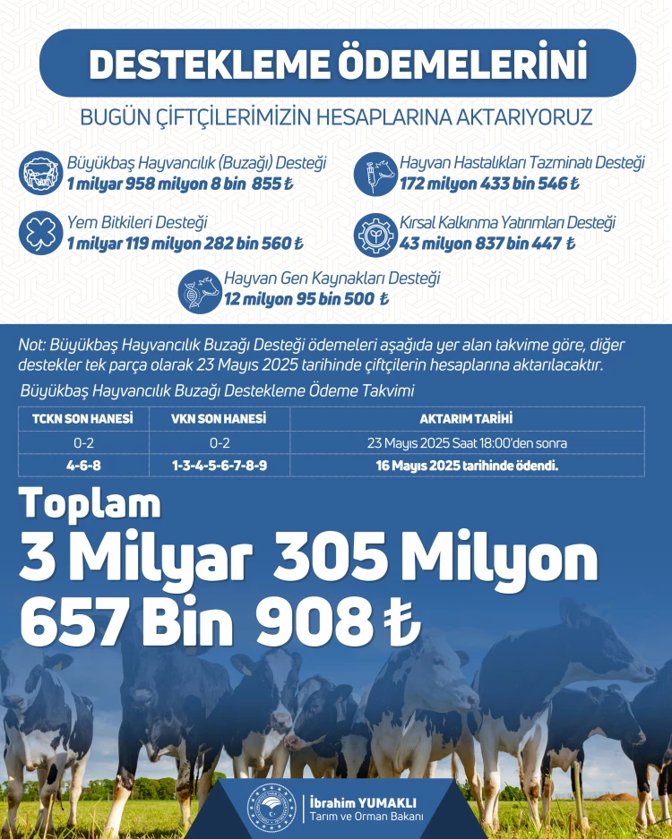 Tarım ve Orman Bakanı İbrahim Yumaklı, çiftçilere 3 milyar 305 milyon 657 bin TL'lik destekleme ödemesinin bugün hesaplara aktarıldığını duyurdu. "Üretime güç, Anadolu'ya bereket" mesajı verdi.