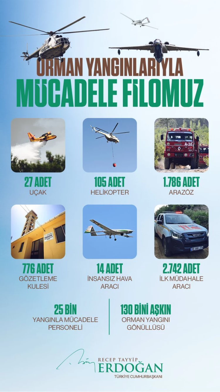 Cumhurbaşkanı Erdoğan, Etimesgut'ta "Yeşil Vatan Kahramanları Görev Başında" programında orman filosuna katılan 27 yeni hava araçlarını tanıttı. Orman yangınlarına karşı dikkat çağrısı yapan Cumhurbaşkanı Erdoğan, "Ateş yakmak felakete davetiye çıkarmaktır" dedi.