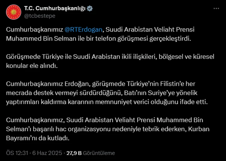 Cumhurbaşkanı Recep Tayyip Erdoğan, Suudi Arabistan Veliaht Prensi Muhammed Bin Selman ile bir telefon görüşmesi gerçekleştirdi.