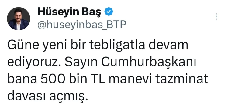 Cumhurbaşkanına hakaret iddiasıyla hakkında adli kontrol ve yurt dışına çıkış yasağı kararı verilen BTP lideri Hüseyin Baş, Erdoğan'ın açtığı tazminat davasıyla ilgili paylaşımında, "Güne yeni bir tebligatla devam ediyoruz. Sayın Cumhurbaşkanı bana 500 bin TL manevi tazminat davası açmış" ifadelerini kullandı.