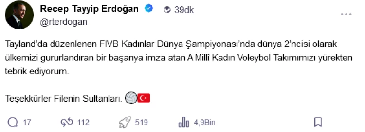 Cumhurbaşkanı Erdoğan, "Filenin Sultanları'nı yürekten tebrik ediyorum. Dünya 2'ncisi olarak ülkemizi gururlandıran bir başarıya imza attılar. Teşekkürler Filenin Sultanları" dedi.