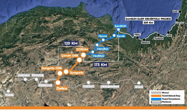Ankara-Kırıkkale-Çorum-Samsun Hızlı Demir Yolu Projesi'nin Delice-Çorum etabının temelinin atıldığını duyuran Cumhurbaşkanı Erdoğan, "Hat, yılda 12 milyon yolcu ve 14 milyon ton yük taşıyacak, Samsun ve Mersin limanlarını birleştirecek. Saatte 200 km hıza uygun planlanan projeyle Çorum-Ankara arası 1 saat 15 dakikaya, Ankara-Samsun arası ise 2029'da tamamlandığında 2,5 saate inecek. 5 istasyon, 8 tünel, 26 köprü ve viyadük ile 16 üst geçitten oluşacak hat, İstanbul ve Çanakkale Boğazları'ndaki yük trafiğini hafifletecek ve Türkiye'yi küresel ticaretin lojistik merkezi yapacak" diye konuştu.
