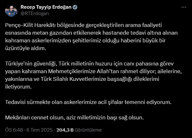 ANKARA (İGFA) - Cumhurbaşkanı Recep Tayyip Erdoğan, Pençe-Kilit Harekâtı bölgesinde 6 Temmuz 2025 tarihinde gerçekleştirilen arama-tarama faaliyeti sırasında metan gazından etkilenen ve hastanede tedavi altına alınan askerlerden bazılarının şehit olduğunu büyük bir üzüntüyle öğrendiğini belirtti.